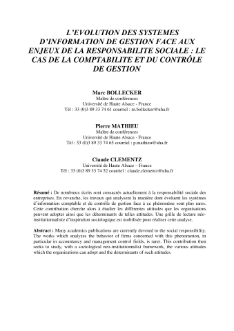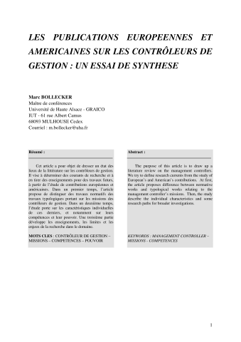 Résumé : De nombreux auteurs mettent l'accent sur la nécessité d'une ouverture disciplinaire dans les travaux de recherche. Notre article vise à analyser l'importance d'une telle démarche au travers de l'étude de ses enjeux et des pratiques des chercheurs en contrôle de gestion. Plus précisément, nous avons tenté de cerner le degré de perméabilité des travaux en contrôle à des cadres conceptuels externes. Pour ce faire, les numéros de revues françaises – Comptabilité, Contrôle, Audit et Finance, Contrôle, Stratégie – et d'une revue américaine – Management science – ont été analysés pour la période 2000-2007.