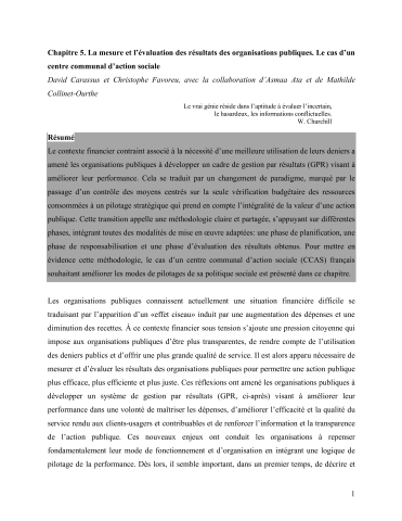 Résumé : Chapitre 5. La mesure et l'évaluation des résultats des organisations publiques. Le cas d'un centre communal d'action sociale David Carassus et Christophe Favoreu, avec la collaboration d'Asmaa Ata et de Mathilde Collinet-Ourthe Le vrai génie réside dans l'aptitude à évaluer l'incertain, le hasardeux, les informations conflictuelles. W. Churchill Résumé Le contexte financier contraint associé à la nécessité d'une meilleure utilisation de leurs deniers a amené les organisations publiques à développer un cadre de gestion par résultats (GPR) visant à améliorer leur performance. Cela se traduit par un changement de paradigme, marqué par le passage d'un contrôle des moyens centrés sur la seule vérification budgétaire des ressources consommées à un pilotage stratégique qui prend en compte l'intégralité de la valeur d'une action publique. Cette transition appelle une méthodologie claire et partagée, s'appuyant sur différentes phases, intégrant toutes des modalités de mise en oeuvre adaptées: une phase de planification, une phase de responsabilisation et une phase d'évaluation des résultats obtenus. Pour mettre en évidence cette méthodologie, le cas d'un centre communal d'action sociale (CCAS) français souhaitant améliorer les modes de pilotages de sa politique sociale est présenté dans ce chapitre. Les organisations publiques connaissent actuellement une situation financière difficile se traduisant par l'apparition d'un «effet ciseau» induit par une augmentation des dépenses et une diminution des recettes. À ce contexte financier sous tension s'ajoute une pression citoyenne qui impose aux organisations publiques d'être plus transparentes, de rendre compte de l'utilisation des deniers publics et d'offrir une plus grande qualité de service. Il est alors apparu nécessaire de mesurer et d'évaluer les résultats des organisations publiques pour permettre une action publique plus efficace, plus efficiente et plus juste. Ces réflexions ont amené les organisations publiques à développer un système de gestion par résultats (GPR, ci-après) visant à améliorer leur performance dans une volonté de maîtriser les dépenses, d'améliorer l'efficacité et la qualité du service rendu aux clients-usagers et contribuables et de renforcer l'information et la transparence de l'action publique. Ces nouveaux enjeux ont conduit les organisations à repenser fondamentalement leur mode de fonctionnement et d'organisation en intégrant une logique de pilotage de la performance. Dès lors, il semble important, dans un premier temps, de décrire et
