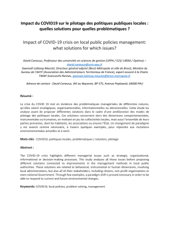 Impact du COVID19 sur le pilotage des politiques publiques locales : quelles solutions pour quelles problématiques ?
