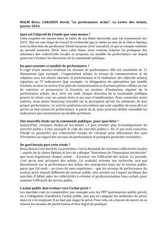 Résumé : Quel est l'objectif de l'étude que vous menez ? Cette enquête est menée dans le cadre de ma thèse doctorale, que j'ai commencée mi-2011. Elle est une étape du travail de recherche que je mène au sein de la chaire Optima, sous la direction du professeur David Carassus (voir encadré), et que je compte soutenir au second semestre 2016. Avec cette thèse, nous voulons éclairer les pratiques des acheteurs des collectivités locales et proposer un modèle de performance sur lequel pourront s'évaluer les directions de la commande publique. En quoi consiste ce modèle de performance ? Il s'agit d'une matrice évaluant les niveaux de performance. Elle est constituée de 11 dimensions (par exemple : l'organisation achats, le niveau de communication et de relations avec les clients internes, la performance et la réalisation des objectifs achats) réparties en 77 indicateurs (par exemple : la désignation de spécialistes par famille d'achats, la mise en oeuvre d'un plan de communication et d'actions pilotes ciblées en vue de valoriser et promouvoir la fonction, un système d'évaluation régulier de la performance achats, etc.). Avec cet outil, chaque direction de la commande publique pourra se situer, voir ses points forts et ses axes d'amélioration. Pour construire notre matrice, nous avons beaucoup travaillé sur la perception qu'ont les acheteurs de leur propre performance ; ce sont les praticiens eux-mêmes qui sont capables de nous dire ce qu'est un bon niveau de performance. A partir de là, nous pouvons définir ensemble les indicateurs qui construisent un modèle pertinent.