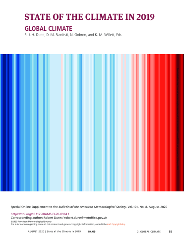 Résumé : Global Climate is one chapter from the State of the Climate in 2019 annual report and is avail- able from https://doi.org/10.1175/BAMS-D-20-0104.1 Compiled by NOAA’s National Centers for Environmental Information, State of the Climate in 2019 is based on contributions from scien- tists from around the world. It provides a detailed update on global climate indicators, notable weather events, and other data collected by environmental monitoring stations and instru- ments located on land, water, ice, and in space. The full report is available from https://doi.org/10.1175/2020BAMSStateoftheClimate.1.