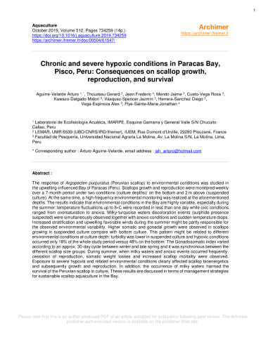 Chronic and severe hypoxic conditions in Paracas Bay, Pisco, Peru: Consequences on scallop growth, reproduction, and survival