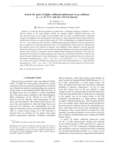 Résumé : Results of a search for the pair production of photon-jets—collimated groupings of photons—in the ATLAS detector at the Large Hadron Collider are reported. Highly collimated photon-jets can arise from the decay of new, highly boosted particles that can decay to multiple photons collimated enough to be identified in the electromagnetic calorimeter as a single, photonlike energy cluster. Data from proton-proton collisions at a center-of-mass energy of 13 TeV, corresponding to an integrated luminosity of 36.7 fb-1, were collected in 2015 and 2016. Candidate photon-jet pair production events are selected from those containing two reconstructed photons using a set of identification criteria much less stringent than that typically used for the selection of photons, with additional criteria applied to provide improved sensitivity to photon-jets. Narrow excesses in the reconstructed diphoton mass spectra are searched for. The observed mass spectra are consistent with the Standard Model background expectation. The results are interpreted in the context of a model containing a new, high-mass scalar particle with narrow width, X, that decays into pairs of photon-jets via new, light particles, a. Upper limits are placed on the cross section times the product of branching ratios σ×B(X→aa)×B(a→γγ)2 for 200 GeV