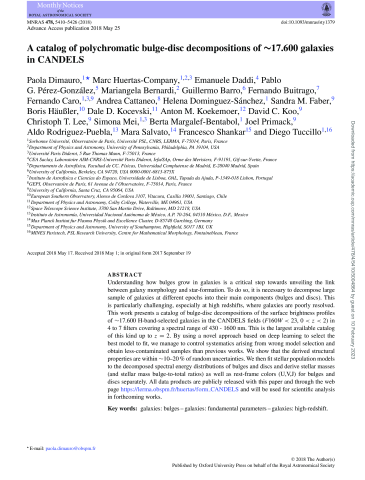 Résumé : Understanding how bulges grow in galaxies is a critical step towards unveiling the link between galaxy morphology and star-formation. To do so, it is necessary to decompose large sample of galaxies at different epochs into their main components (bulges and discs). This is particularly challenging, especially at high redshifts, where galaxies are poorly resolved. This work presents a catalog of bulge-disc decompositions of the surface brightness profiles of ˜17.600 H-band-selected galaxies in the CANDELS fields (F160W < 23, 0 < z < 2) in 4 to 7 filters covering a spectral range of 430 - 1600 nm. This is the largest available catalog of this kind up to z = 2. By using a novel approach based on deep learning to select the best model to fit, we manage to control systematics arising from wrong model selection and obtain less-contaminated samples than previous works. We show that the derived structural properties are within ˜ 10-20% of random uncertainties. We then fit stellar population models to the decomposed spectral energy distributions of bulges and discs and derive stellar masses (and stellar mass bulge-to-total ratios) as well as rest-frame colors (U,V,J) for bulges and discs separately. All data products are publicly released with this paper and through the web page https://lerma.obspm.fr/huertas/form_CANDELS and will be used for scientific analysis in forthcoming works.