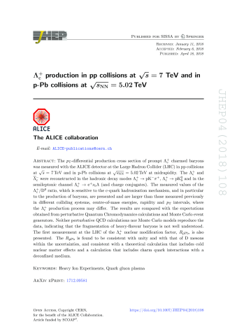 Résumé : The p$_{T}$-differential production cross section of prompt Λ$_{c}^{+}$ charmed baryons was measured with the ALICE detector at the Large Hadron Collider (LHC) in pp collisions at $ \sqrt{s}=7 $ TeV and in p-Pb collisions at $ \sqrt{s_{\mathrm{NN}}}=5.02 $ TeV at midrapidity. The Λ$_{c}^{+}$ and $ {\overline{\varLambda}}_{\overline{\mathrm{c}}} $ were reconstructed in the hadronic decay modes Λ$_{c}^{+}$ → pK$^{−}$π$^{+}$, Λ$_{c}^{+}$ → pK$_{S}^{0}$ and in the semileptonic channel Λ$_{c}^{+}$ → e$^{+}$ν$_{e}$Λ (and charge conjugates). The measured values of the Λ$_{c}^{+}$ /D$^{0}$ ratio, which is sensitive to the c-quark hadronisation mechanism, and in particular to the production of baryons, are presented and are larger than those measured previously in different colliding systems, centre-of-mass energies, rapidity and p$_{T}$ intervals, where the Λ$_{c}^{+}$ production process may differ. The results are compared with the expectations obtained from perturbative Quantum Chromodynamics calculations and Monte Carlo event generators. Neither perturbative QCD calculations nor Monte Carlo models reproduce the data, indicating that the fragmentation of heavy-flavour baryons is not well understood. The first measurement at the LHC of the Λ$_{c}^{+}$ nuclear modification factor, R$_{pPb}$, is also presented. The R$_{pPb}$ is found to be consistent with unity and with that of D mesons within the uncertainties, and consistent with a theoretical calculation that includes cold nuclear matter effects and a calculation that includes charm quark interactions with a deconfined medium.