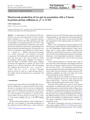 Résumé : A measurement of the electroweak (EW) production of two jets in association with a $\mathrm {Z} $ boson in proton-proton collisions at $\sqrt{s}=13\,\text {TeV} $ is presented, based on data recorded in 2016 by the CMS experiment at the LHC corresponding to an integrated luminosity of 35.9 $\,\text {fb}^{\text {--}1}$ . The measurement is performed in the $\ell \ell \mathrm {jj}$ final state with $\ell $ including electrons and muons, and the jets j corresponding to the quarks produced in the hard interaction. The measured cross section in a kinematic region defined by invariant masses $m_{\ell \ell } >50\,\text {GeV} $ , $m_{\mathrm {jj}} >120\,\text {GeV} $ , and transverse momenta $p_{\mathrm {T j}} > 25\,\text {GeV}$ is $\sigma _\mathrm {EW}(\ell \ell \mathrm {jj})= 534 \pm 20\,\text {(stat)} \pm 57\,\text {(syst) fb} $ , in agreement with leading-order standard model predictions. The final state is also used to perform a search for anomalous trilinear gauge couplings. No evidence is found and limits on anomalous trilinear gauge couplings associated with dimension-six operators are given in the framework of an effective field theory. The corresponding 95% confidence level intervals are $-2.6< c_{WWW}/\varLambda ^2 < 2.6\,\text {TeV}^{-2}$ and $-8.4< c_{W}/\varLambda ^2 < 10.1\,\text {TeV}^{-2}$ . The additional jet activity of events in a signal-enriched region is also studied, and the measurements are in agreement with predictions.