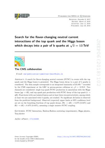 Résumé : A search for flavor-changing neutral currents (FCNC) in events with the top quark and the Higgs boson is presented. The Higgs boson decay to a pair of b quarks is considered. The data sample corresponds to an integrated luminosity of 35.9 fb$^{−1}$ recorded by the CMS experiment at the LHC in proton-proton collisions at $ \sqrt{s}=13 $ TeV. Two channels are considered: single top quark FCNC production in association with the Higgs boson (pp → tH), and top quark pair production with FCNC decay of the top quark (t → qH). Final states with one isolated lepton and at least three reconstructed jets, among which at least two are associated with b quarks, are studied. No significant deviation is observed from the predicted background. Observed (expected) upper limits at 95% confidence level are set on the branching fractions of top quark decays, ℬ(t → uH) < 0.47% (0.34%) and ℬ(t → cH) < 0.47% (0.44%), assuming a single nonzero FCNC coupling.