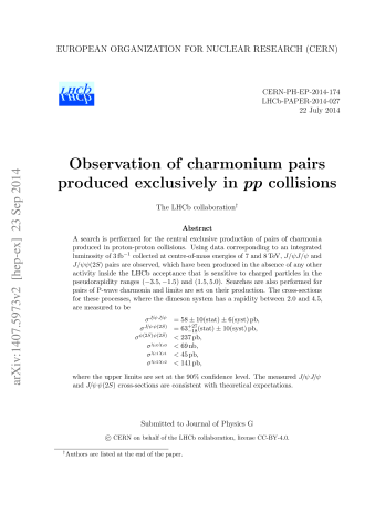 Résumé : A search is performed for the central exclusive production of pairs of charmonia produced in proton-proton collisions. Using data corresponding to an integrated luminosity of $3{\rm\ fb}^{-1}$ collected at centre-of-mass energies of 7 and 8 TeV, $J/\psi J/\psi$ and $J/\psi\psi(2S)$ pairs are observed, which have been produced in the absence of any other activity inside the LHCb acceptance that is sensitive to charged particles in the pseudorapidity ranges $(-3.5,-1.5)$ and $(1.5,5.0)$. Searches are also performed for pairs of P-wave charmonia and limits are set on their production. The cross-sections for these processes, where the dimeson system has a rapidity between 2.0 and 4.5, are measured to be $$ \begin{array}{rl} \sigma^{J/\psi J/\psi} &= 58\pm10{(\rm stat)} \pm 6{(\rm syst)} {\rm\ pb} , \\ \sigma^{J/\psi\psi(2S)} &= 63 ^{+27}_{-18}{(\rm stat)}\pm 10{(\rm syst)} {\rm\ pb} , \\ \sigma^{\psi(2S)\psi(2S)} &< 237 {\rm\ pb}, \\ \sigma^{\chi_{c0}\chi_{c0}} &< 69 {\rm\ nb}, \\ \sigma^{\chi_{c1}\chi_{c1}} &< 45 {\rm\ pb}, \\ \sigma^{\chi_{c2}\chi_{c2}} &< 141 {\rm\ pb}, \\ \end{array} $$ where the upper limits are set at the 90% confidence level. The measured $J/\psi J/\psi$ and $J/\psi\psi(2S)$ cross-sections are consistent with theoretical expectations.