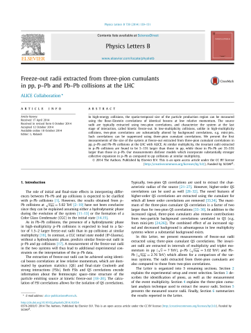 Résumé : In high-energy collisions, the spatio-temporal size of the particle production region can be measured using the Bose–Einstein correlations of identical bosons at low relative momentum. The source radii are typically extracted using two-pion correlations, and characterize the system at the last stage of interaction, called kinetic freeze-out. In low-multiplicity collisions, unlike in high-multiplicity collisions, two-pion correlations are substantially altered by background correlations, e.g. mini-jets. Such correlations can be suppressed using three-pion cumulant correlations. We present the first measurements of the size of the system at freeze-out extracted from three-pion cumulant correlations in pp, p–Pb and Pb–Pb collisions at the LHC with ALICE. At similar multiplicity, the invariant radii extracted in p–Pb collisions are found to be 5–15% larger than those in pp, while those in Pb–Pb are 35–55% larger than those in p–Pb. Our measurements disfavor models which incorporate substantially stronger collective expansion in p–Pb as compared to pp collisions at similar multiplicity.