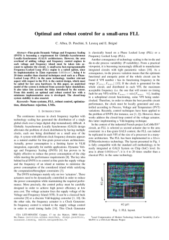 Résumé : Fine-grain Dynamic Voltage and Frequency Scaling (DVFS) is becoming a requirement for Globally-Asynchronous Locally-Synchronous (GALS) architectures. However, the area overhead of adding voltage and frequency control engines in each voltage and frequency island must be taken into account to optimize the circuit. A small-area fast-reprogrammable Frequency-Locked Loop (FLL) engine is a suited option, since its implementation in 32nm represents 0.0016mm 2, being 4 to 20 times smaller than classical techniques used such as a Phase-Locked Loop (PLL) in the same technology. Another relevant aspect with respect to the FLL is the control design, which must be suited for low area hardware. In this paper, an analytical model of the system is deduced from accurate Spice simulations. It also takes into account the delay introduced by the sensor. From this model, an optimal and robust control law with a minimum implementation area is developed. The closed-loop system stability is also ensured.