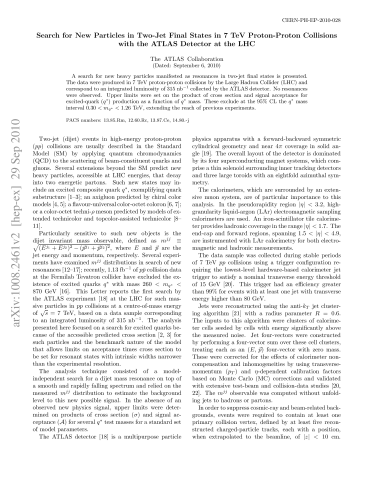 Résumé : A search for new heavy particles manifested as narrow resonances in two-jet final states is presented. The data were produced in 7 TeV proton-proton collisions by the Large Hadron Collider (LHC) and correspond to an integrated luminosity of 315 nb$^{-1}$ collected by the ATLAS detec. No resonances were observed. Upper limits were set on the product of cross section and signal acceptance for excited-quark (q*) production as a function of q* mass. These exclude at the 95% CL the q* mass interval 0.40 < mq* < 1.26 TeV, extending the reach of previous experiments.