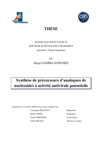 Résumé : Ce manuscrit détaille différentes méthodes de synthèse des sulfoxydes vinyliques ainsi que leurs utilisations dans une réaction d'addition conjuguée intramoléculaire pour obtenir des 1,3-diols syn. Ces derniers sont employés pour la synthèse de précurseurs d'analogues de nucléosides. Dans le premier chapitre, nous montrerons différents aspects importants de la chimie des nucléosides et de leurs analogues; nous présenterons leur mécanisme d'action, ainsi que des médicaments à structure nucléosidique utilisés pour traiter différentes maladies virales. Par la suite, nous décrirons quelques méthodes de synthèses décrites dans la littérature pour ce type de molécules, ainsi que quelques exemples pour la synthèse des motifs 1,3-diols syn, sans vouloir être exhaustif ni trop entrer dans les détails. Le deuxième chapitre présente les différentes méthodes de synthèse que nous avons utilisées pour la synthèse des sulfoxydes vinyliques. Ces derniers sont les précurseurs de la réaction d'addition conjuguée intramoléculaire que nous utilisons pour la mise en place du motif 1,3-diol syn, cette réaction ainsi que les résultats obtenus seront discutés dans le chapitre 3. Finalement, nous exposerons les résultats obtenus pour la réaction de Pummerer et la réaction de cyclisation en milieu acide, qui nous a permis d'obtenir les analogues du 3-désoxyribose et ses analogues.