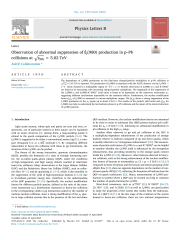 Résumé : The dependence of $\mathrm{f}_{0}$(980) production on the final-state charged-particle multiplicity in p$-$Pb collisions at $\sqrt{s_{\mathrm{NN}}} = 5.02$ TeV is reported. The production of $\mathrm{f}_{0}$(980) is measured with the ALICE detector via the $\mathrm{f}_0 (980) \rightarrow \pi^{+}\pi^{-}$ decay channel in a midrapidity region of $-0.5