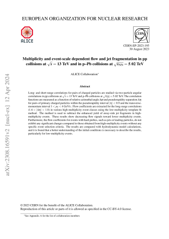 Résumé : Long- and short-range correlations for pairs of charged particles are studied via two-particle angular correlations in pp collisions at $\sqrt{s}=13$ TeV and p$-$Pb collisions at $\sqrt{s_\mathrm{NN}} = 5.02$ TeV. The correlation functions are measured as a function of relative azimuthal angle $\Delta\varphi$ and pseudorapidity separation $\Delta\eta$ for pairs of primary charged particles within the pseudorapidity interval $|\eta| < 0.9$ and the transverse-momentum interval $1 < p_{\rm T} < 4$ GeV/$c$. Flow coefficients are extracted for the long-range correlations ($1.6 < |\Delta\eta| <1.8$) in various high-multiplicity event classes using the low-multiplicity template fit method. The method is used to subtract the enhanced yield of away-side jet fragments in high-multiplicity events. These results show decreasing flow signals toward lower multiplicity events. Furthermore, the flow coefficients for events with hard probes, such as jets or leading particles, do not exhibit any significant changes compared to those obtained from high-multiplicity events without any specific event selection criteria. The results are compared with hydrodynamic-model calculations, and it is found that a better understanding of the initial conditions is necessary to describe the results, particularly for low-multiplicity events.