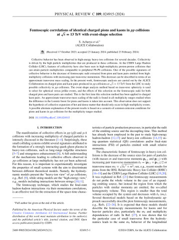 Résumé : Collective behavior has been observed in high-energy heavy-ion collisions for several decades. Collectivity is driven by the high particle multiplicities that are produced in these collisions. At the Large Hadron Collider (LHC), features of collectivity have also been seen in high-multiplicity proton-proton collisions that can attain particle multiplicities comparable to peripheral Pb-Pb collisions. One of the possible signatures of collective behavior is the decrease of femtoscopic radii extracted from pion and kaon pairs emitted from high-multiplicity collisions with increasing pair transverse momentum. This decrease can be described in terms of an approximate transverse mass scaling. In the present work, femtoscopic analyses are carried out by the ALICE collaboration on charged pion and kaon pairs produced in pp collisions at $\sqrt{s}=13$ TeV from the LHC to study possible collectivity in pp collisions. The event-shape analysis method based on transverse sphericity is used to select for spherical versus jet-like events, and the effects of this selection on the femtoscopic radii for both charged pion and kaon pairs are studied. This is the first time this selection method has been applied to charged kaon pairs. An approximate transverse-mass scaling of the radii is found in all multiplicity ranges studied when the difference in the Lorentz boost for pions and kaons is taken into account. This observation does not support the hypothesis of collective expansion of hot and dense matter that should only occur in high-multiplicity events. A possible alternate explanation of the present results is based on a scenario of common emission conditions for pions and kaons in pp collisions for the multiplicity ranges studied.