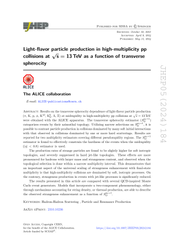 Résumé : Results on the transverse spherocity dependence of light-flavor particle production ($\pi$, K, p, $\phi$, ${\rm K^{*0}}$, ${\rm K}^{0}_{\rm{S}}$, $\Lambda$, $\Xi$) at midrapidity in high-multiplicity pp collisions at $\sqrt{s} = 13$ TeV were obtained with the ALICE apparatus. The transverse spherocity estimator ($S_{{\rm O}}^{{\it p}_{\rm T}=1}$) categorizes events by their azimuthal topology. Utilizing narrow selections on $S_{\text{O}}^{{\it p}_{\rm T}=1}$, it is possible to contrast particle production in collisions dominated by many soft initial interactions with that observed in collisions dominated by one or more hard scatterings. Results are reported for two multiplicity estimators covering different pseudorapidity regions. The $S_{{\rm O}}^{{\it p}_{\rm T}=1}$ estimator is found to effectively constrain the hardness of the events when the midrapidity ($\left | \eta \right |< 0.8$) estimator is used. The production rates of strange particles are found to be slightly higher for soft isotropic topologies, and severely suppressed in hard jet-like topologies. These effects are more pronounced for hadrons with larger mass and strangeness content, and observed when the topological selection is done within a narrow multiplicity interval. This demonstrates that an important aspect of the universal scaling of strangeness enhancement with final-state multiplicity is that high-multiplicity collisions are dominated by soft, isotropic processes. On the contrary, strangeness production in events with jet-like processes is significantly reduced. The results presented in this article are compared with several QCD-inspired Monte Carlo event generators. Models that incorporate a two-component phenomenology, either through mechanisms accounting for string density, or thermal production, are able to describe the observed strangeness enhancement as a function of $S_{{\rm O}}^{{\it p}_{\rm T}=1}$.