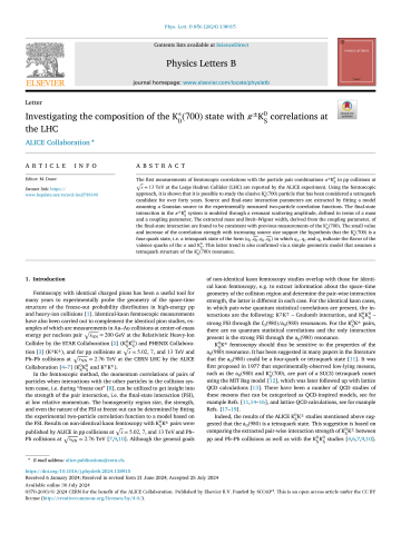 Résumé : The first measurements of femtoscopic correlations with the particle pair combinations $\pi^\pm$K$^0_{\rm S}$ in pp collisions at $\sqrt{s}=13$ TeV at the Large Hadron Collider (LHC) are reported by the ALICE experiment. Using the femtoscopic approach, it is shown that it is possible to study the elusive K$^*_0(700)$ particle that has been considered a tetraquark candidate for over forty years. Boson source parameters and final-state interaction parameters are extracted by fitting a model assuming a Gaussian source to the experimentally measured two-particle correlation functions. The final-state interaction is modeled through a resonant scattering amplitude, defined in terms of a mass and a coupling parameter, decaying into a $\pi^\pm$K$^0_{\rm S}$ pair. The extracted mass and Breit-Wigner width, derived from the coupling parameter, of the final-state interaction are found to be consistent with previous measurements of the K$^*_0(700)$. The small value and increasing behavior of the correlation strength with increasing source size support the hypothesis that the K$^*_0(700)$ is a four-quark state, i.e. a tetraquark state. This latter trend is also confirmed via a simple geometric model that assumes a tetraquark structure of the K$^*_0(700)$ resonance.