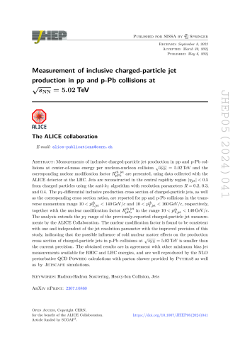 Résumé : Measurements of inclusive charged-particle jet production in pp and p-Pb collisions at center-of-mass energy per nucleon-nucleon collision $\sqrt{s_{\rm NN}} = 5.02$ TeV and the corresponding nuclear modification factor $R_{\rm pPb}^{\rm ch\,jet}$ are presented, using data collected with the ALICE detector at the LHC. Jets are reconstructed in the central rapidity region $|\eta_{\rm jet}| < 0.5$ from charged particles using the anti-$k_{\rm T}$ algorithm with resolution parameters $R = 0.2$, 0.3, and 0.4. The $p_{\rm T}$-differential inclusive production cross section of charged-particle jets, as well as the corresponding cross-section ratios, are reported for pp and p-Pb collisions in the transverse momentum range $10 < p^{\rm ch}_{\rm T,jet} < 140$ GeV/$c$ and $10 < p^{\rm ch}_{\rm T,jet} < 160$ GeV/$c$, respectively, together with the nuclear modification factor $R_{\rm pPb}^{\rm ch\,jet}$ in the range $10 < p^{\rm ch}_{\rm T,jet} < 140$ GeV/$c$. The analysis extends the $p_{\rm T}$ range of the previously-reported charged-particle jet measurements by the ALICE Collaboration. The nuclear modification factor is found to be consistent with one and independent of the jet resolution parameter with the improved precision of this study, indicating that the possible influence of cold nuclear matter effects on the production cross section of charged-particle jets in p-Pb collisions at $\sqrt{s_{\rm NN}} = 5.02$ TeV is smaller than the current precision. The obtained results are in agreement with other minimum bias jet measurements available for RHIC and LHC energies, and are well reproduced by the NLO perturbative QCD POWHEG calculations with parton shower provided by PYTHIA8 as well as by JETSCAPE simulations.