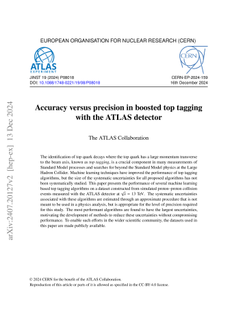 Résumé : The identification of top quark decays where the top quark has a large momentum transverse to the beam axis, known as $top$$tagging$, is a crucial component in many measurements of Standard Model processes and searches for beyond the Standard Model physics at the Large Hadron Collider. Machine learning techniques have improved the performance of top tagging algorithms, but the size of the systematic uncertainties for all proposed algorithms has not been systematically studied. This paper presents the performance of several machine learning based top tagging algorithms on a dataset constructed from simulated proton-proton collision events measured with the ATLAS detector at $\sqrt{s} = 13$ TeV. The systematic uncertainties associated with these algorithms are estimated through an approximate procedure that is not meant to be used in a physics analysis, but is appropriate for the level of precision required for this study. The most performant algorithms are found to have the largest uncertainties, motivating the development of methods to reduce these uncertainties without compromising performance. To enable such efforts in the wider scientific community, the datasets used in this paper are made publicly available.