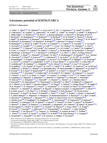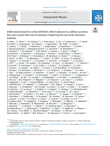 Résumé : KM3NeT/ARCA is a Cherenkov neutrino telescope under construction in the Mediterranean sea, optimised for the detection of astrophysical neutrinos with energies above ∼1 TeV. In this work, using Monte Carlo simulations including all-flavour neutrinos, the integrated and differential sensitivities for KM3NeT/ARCA are presented considering the case of a diffuse neutrino flux as well as extended and point-like neutrino sources. This analysis is applied to Starburst Galaxies demonstrating that the detector has the capability of tracing TeV neutrinos from these sources. Remarkably, after eight years, a hard power-law spectrum from the nearby Small Magellanic Cloud can be constrained. The sensitivity and discovery potential for NGC 1068 is also evaluated showing that KM3NeT/ARCA will discriminate between different astrophysical components of the measured neutrino flux after 3 years of data taking.