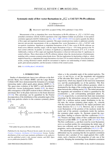 Résumé : Measurements of the $p_{\rm T}$-dependent flow vector fluctuations in Pb-Pb collisions at $\sqrt{s_{_{\rm NN}}} = 5.02~\mathrm{TeV}$ using azimuthal correlations with the ALICE experiment at the LHC are presented. A four-particle correlation approach [1] is used to quantify the effects of flow angle and magnitude fluctuations separately. This paper extends previous studies to additional centrality intervals and provides measurements of the $p_{\rm T}$-dependent flow vector fluctuations at $\sqrt{s_{_{\rm NN}}} = 5.02~\mathrm{TeV}$ with two-particle correlations. Significant $p_{\rm T}$-dependent fluctuations of the $\vec{V}_{2}$ flow vector in Pb-Pb collisions are found across different centrality ranges, with the largest fluctuations of up to $\sim$15% being present in the 5% most central collisions. In parallel, no evidence of significant $p_{\rm T}$-dependent fluctuations of $\vec{V}_{3}$ or $\vec{V}_{4}$ is found. Additionally, evidence of flow angle and magnitude fluctuations is observed with more than $5\sigma$ significance in central collisions. These observations in Pb-Pb collisions indicate where the classical picture of hydrodynamic modeling with a common symmetry plane breaks down. This has implications for hard probes at high $p_{\rm T}$, which might be biased by $p_{\rm T}$-dependent flow angle fluctuations of at least 23% in central collisions. Given the presented results, existing theoretical models should be re-examined to improve our understanding of initial conditions, quark--gluon plasma (QGP) properties, and the dynamic evolution of the created system.