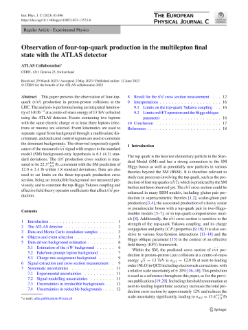 Résumé : This paper presents the observation of four-top-quark ($t\bar{t}t\bar{t}$) production in proton-proton collisions at the LHC. The analysis is performed using an integrated luminosity of 140 fb$^{-1}$ at a centre-of-mass energy of 13 TeV collected using the ATLAS detector. Events containing two leptons with the same electric charge or at least three leptons (electrons or muons) are selected. Event kinematics are used to separate signal from background through a multivariate discriminant, and dedicated control regions are used to constrain the dominant backgrounds. The observed (expected) significance of the measured $t\bar{t}t\bar{t}$ signal with respect to the standard model (SM) background-only hypothesis is 6.1 (4.3) standard deviations. The $t\bar{t}t\bar{t}$ production cross section is measured to be $22.5^{+6.6}_{-5.5}$ fb, consistent with the SM prediction of $12.0 \pm 2.4$ fb within 1.8 standard deviations. Data are also used to set limits on the three-top-quark production cross section, being an irreducible background not measured previously, and to constrain the top-Higgs Yukawa coupling and effective field theory operator coefficients that affect $t\bar{t}t\bar{t}$ production.