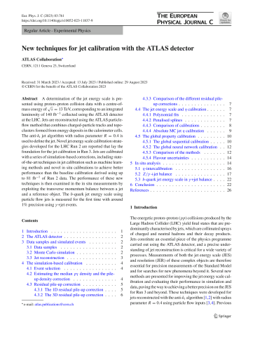 Résumé : A determination of the jet energy scale is presented using proton$-$proton collision data with a centre-of-mass energy of $\sqrt{s}=13$ TeV, corresponding to an integrated luminosity of 140 fb$^{-1}$ collected using the ATLAS detector at the LHC. Jets are reconstructed using the ATLAS particle-flow method that combines charged-particle tracks and topo-clusters formed from energy deposits in the calorimeter cells. The anti-$k_{t}$ jet algorithm with radius parameter $R=0.4$ is used to define the jet. Novel jet energy scale calibration strategies developed for the LHC Run 2 are reported that lay the foundation for the jet calibration in Run 3. Jets are calibrated with a series of simulation-based corrections, including state-of-the-art techniques in jet calibration such as machine learning methods and novel $\textit{in situ}$ calibrations to achieve better performance than the baseline calibration derived using up to 81 fb$^{-1}$ of Run 2 data. The performance of these new techniques is then examined in the $\textit{in situ}$ measurements by exploiting the transverse momentum balance between a jet and a reference object. The $b$-quark jet energy scale using particle flow jets is measured for the first time with around 1% precision using $\gamma$+jet events.