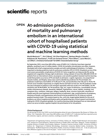 At-admission prediction of mortality and pulmonary embolism in an international cohort of hospitalised patients with COVID-19 using statistical and machine learning methods