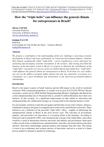 Résumé : We propose a contribution to the understanding of the new challenges concerning economic development in Brazil and more particularly on University-Government-Industry relations. This triptych, academically called "triple helix", can be considered as a lever and motor for anchoring and developing economic investments in the territory. After having described the situation of the innovation system in Brazil, we propose to illustrate the contributions of the "triple helix" concept for two success stories in southern Brazil and explain how "triple helix" could influence the general climate for entrepreneurs in Brazil. From these two case studies, one can see the ability to promote public policies but also new innovative ecosystems as a consequence of a good enrollment and involvement in the university-government-industry relationships.