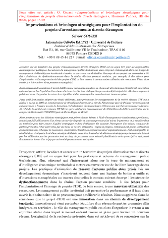 Résumé : Un projet d'IDE peut être considéré comme une innovation pour le développemet du territoire à condition de faire preuve d'agilité stratégique et d'appliquer les principes du managemet public territorial. L'originalité de la recherche présentée dans cet article est de se concentrer sur la phase d'implantation du cycle de vie du projet d'IDE et dans une perspective managériale, avec deux exemples, qui ont en commun de concernenr des secteurs de hautes technologies, sont présentés : celui de la société chinoise ZTE sur le site du Futuroscope près de Poitiers et celui de la société sud-coréenne HT Micron près de Porto Alegre au Brésil.