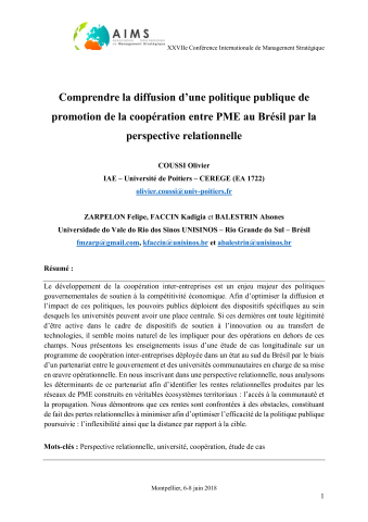Comprendre la diffusion d’une politique publique de promotion de la coopération entre PME au Brésil par la perspective relationnelle.