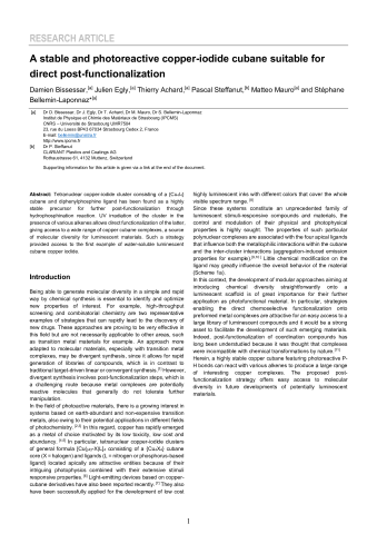 Résumé : Tetranuclear copper-iodide cluster consisting of a {Cu4I4} cubane and diphenylphosphine ligand has been found as a highly stable precursor for further post-functionalization through hydrophosphination reaction. UV irradiation of the cluster in the presence of various alkenes allows direct functionalization of the latter, giving access to a wide range of copper cubane complexes, a source of molecular diversity for luminescent materials. Such a strategy provided access to the first example of water-soluble luminescent cubane copper iodide.