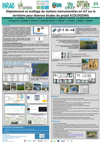 Résumé : Dans ce poster, nous présentons les déploiements des différents types de stations instrumentées développées dans le cadre du projet "ECOLOGGING", réalisés au cours de l’année 2024/2025, ainsi que les principales évolutions, les résultats obtenus et les conclusions. Les stations ECOLOGGING sont déployées en fonction de la nature des études menées et des besoins scientifiques spécifiques associés.