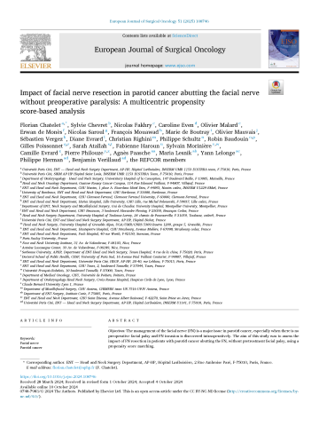 Résumé : Objectives The management of the facial nerve (FN) is a major issue in parotid cancer, especially when there is no preoperative facial palsy and FN invasion is discovered intraoperatively. The aim of this study was to assess the impact of FN resection in patients with parotid cancer abutting the FN, without pretreatment facial palsy, using a propensity score matching. Materials and methods Data from all patients treated between 2009 and 2020 for a primary parotid cancer abutting or invading the FN but without pretreatment facial palsy were extracted from the national multicentric REFCOR database. Three different definitions of tumors abutting the FN were used for sensitivity analyses, in a retrospective setting. Propensity score matching was used to assess the impact of FN resection on disease-free survival (DFS), overall survival (OS) and locoregional recurrence-free survival (LRRFS). Results A total of 163 patients with parotid cancer abutting or invading the FN without pretreatment facial palsy were included. Among them, 99 patients (61%) underwent FN resection. After overlap weighting and multiple imputation, no benefit of FN resection over preservation was found in terms of OS (HR= 1.21, p= 0.6), DFS (HR= 0.88, p= 0.5) and LRRFS (HR= 0.99, p= 1). Sensitivity analyses revealed similar results, and no significant efficacy was found in the subgroup analyses. Conclusion In this retrospective study with propensity score analysis, FN resection did not improve survival outcomes in patients without preoperative facial palsy treated surgically for a primary parotid cancer abutting the FN. In line with recent guidelines, the results of this study suggest that FN preservation should be considered whenever possible in this specific group of patients.