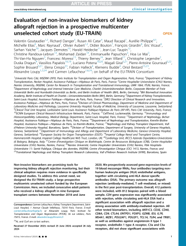 Résumé : Non-invasive biomarkers are promising tools for improving kidney allograft rejection monitoring, but their clinical adoption requires more evidence in specifically designed studies. To address this unmet need, we designed the EU-TRAIN study, a large prospective multicentric unselected cohort funded by the European Commission. Here, we included consecutive adult patients who received a kidney allograft in nine European transplant centers between November 2018 and June 2020. We prospectively assessed gene expression levels of 19 blood messenger RNAs, four antibodies targeting non-human leukocyte antigen (HLA) endothelial antigens, together with circulating anti-HLA donor-specific antibodies (DSA). The primary outcome was allograft rejection (antibody-mediated, T cell-mediated, or mixed) in the first year post-transplantation. Overall, 412 patients were included, with 812 biopsies paired with a blood sample. CD4 gene expression was significantly associated with rejection, while circulating anti-HLA DSA had a significant association with allograft rejection and a strong association with antibody-mediated rejection. All other tested biomarkers, including AKR1C3, CD3E, CD40, CD8A, CD9, CTLA4, ENTPD1, FOXP3, GZMB, ID3, IL7R, MS4A1, MZB1, POU2AF1, POU2F1, TCL1A, TLR4, and TRIB1, as well as antibodies against angiotensin II type 1 receptor, endothelin 1 type A receptor, C3a and C5a receptors, did not show significant associations with allograft rejection. The blood messenger RNAs and non-HLA antibodies did not show an additional value beyond standard of care monitoring parameters and circulating anti-HLA DSA to predict allograft rejection in the first year post-transplantation. Thus, our results open avenues for specifically designed studies to demonstrate the clinical relevance and implementation of other candidate non-invasive biomarkers in kidney transplantation practice.