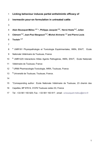 Résumé : Licking behaviour in cattle has been reported to account for the disposition of topically administered macrocyclic lactones. However, its impact on anthelmintic efficacy remains to be established. Therefore, we evaluated the impact of ivermectin exchange between cattle on the reduction in the faecal egg count (FEC) after pour-on administration in a group of 10 heifers experimentally infected with Ostertagia ostertagi and Cooperia oncophora. Four treated (500 μg/kg, pour-on) and six untreated animals were put together after treatment and plasma and faecal exposure to ivermectin as well as the FECs were evaluated before and over 40 days after treatment. Ivermectin was detected in plasma and faeces of the six untreated heifers, with maximal exposures two- to three-fold lower than the minimal exposures in treated animals. The interindividual variability of exposure was very high in untreated animals, with a 10-fold difference between the upper and lower limits compared with treated heifers, where there was only a two-fold difference. Anthelmintic efficacy, expressed as an average reduction of the FECs over the experimental period, was maximal in the treated group. In untreated heifers, anthelmintic efficacies ranged from zero to maximal efficacy, with intermediary values between 30 and 80%. The use of a classical pharmacodynamic model demonstrated a clear relationship between exposure and efficacy and enabled us to define the critical plasma or faecal ivermectin concentrations delimiting an exposure window associated with partial anthelmintic efficacy. This range of ivermectin plasma concentrations (0.1-1 ng/mL) could be considered as a potential selection window for anthelmintic resistance. Finally, our results show that macrocyclic lactone exchange between cattle after pour-on administration, resulting from natural grooming behaviour, can significantly impact on anthelmintic efficacy. This raises several issues such as the design of comparative clinical trials and the occurrence of partial efficacy which is considered a risk factor for the development of anthelmintic resistance.