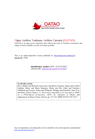 Résumé : This chapter describes the development of an integrated stereovision sensor intended to be embedded on mobile platforms like robots or intelligent vehicles. Such a sensor is required for the motion control of these platforms. Navigation can be either autonomous (e.g. for a robot executing tasks in dangerous environments), or supervised by a human driver (typically for intelligent transportation systems).