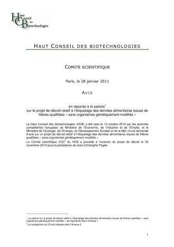 AVIS en réponse à la saisine sur le projet de décret relatif à l’étiquetage des denrées alimentaires issues de filières qualifiées « sans organismes génétiquement modifiés »