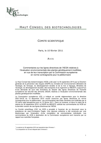 AVIS Commentaires sur les lignes directrices de l’AESA relatives à l’évaluation environnementale des plantes génétiquement modifiées, en vue de leur transcription par la Commission européenne en norme contraignante pour le pétitionnaire