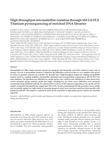 Résumé : Microsatellites (or SSRs: simple sequence repeats) are among the most frequently used DNA markers in many areas of research. The use of microsatellite markers is limited by the difficulties involved in their de novo isolation from species for which no genomic resources are available. We describe here a high-throughput method for isolating microsatellite markers based on coupling multiplex microsatellite enrichment and next-generation sequencing on 454 GS-FLX Titanium platforms. The procedure was calibrated on a model species (Apis mellifera) and validated on 13 other species from various taxonomic groups (animals, plants and fungi), including taxa for which severe difficulties were previously encountered using traditional methods. We obtained from 11 497 to 34 483 sequences depending on the species and the number of detected microsatellite loci ranged from 199 to 5791. We thus demonstrated that this procedure can be readily and successfully applied to a large variety of taxonomic groups, at much lower cost than would have been possible with traditional protocols. This method is expected to speed up the acquisition of high-quality genetic markers for nonmodel organisms.