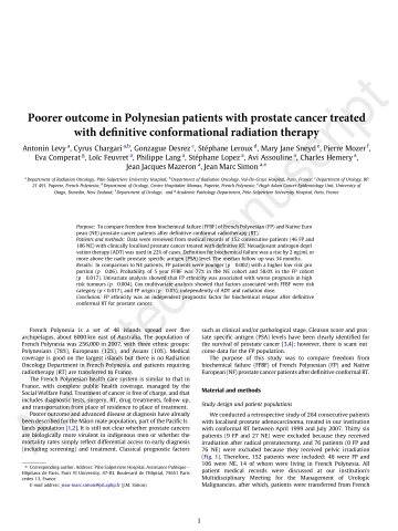 Résumé : Purpose To compare freedom from biochemical failure (FFBF) of French Polynesian (FP) and Native European (NE) prostate cancer patients after definitive conformal radiotherapy (RT). Patients and methods Data were reviewed from medical records of 152 consecutive patients (46 FP and 106 NE) with clinically localised prostate cancer treated with definitive RT. Neoadjuvant androgen deprivation therapy (ADT) was used in 22% of cases. Definition for biochemical failure was a rise by 2ng/mL or more above the nadir prostate-specific antigen (PSA) level. The median follow-up was 34months. Results In comparison to NE patients, FP patients were younger (p=0.002) with a higher low-risk proportion (p=0.06). Probability of 5-year FFBF was 77% in the NE cohort and 58.0% in the FP cohort (p=0.017). Univariate analysis showed that FP ethnicity was associated with worse prognosis in high-risk tumours (p=0.004). Cox multivariate analysis showed that factors associated with FFBF were risk category (p<0.017), and FP origin (p=0.03), independently of ADT and radiation dose. Conclusion FP ethnicity was an independent prognostic factor for biochemical relapse after definitive conformal RT for prostate cancer.