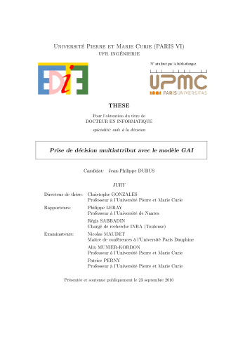 Résumé : Les réseaux GAI sont une représentation graphique compacte et expressive des préférences d'un décideur en Décision Multiattribut, c'est-à-dire dans des situations où les alternatives sur lesquelles portent les choix du décideur sont décrites à l'aide d'un ensemble d'attributs (de caractéristiques). L'exploitation de leur structure graphique permet de définir des procédures efficaces d'élicitation de préférences (détermination des préférences à l'aide de questionnaires) ainsi que des algorithmes assez performants de prise de décision (calcul de l'alternative préférée du décideur ou des k meilleures alternatives). Le but de cette thèse est double. Tout d'abord elle vise à étendre les algorithmes de prise de décision dans des cas où les réseaux GAI sont denses, c'est-à-dire dans des situations où leur structure ne permet pas aux algorithmes de l'état de l'art de s'exécuter en un temps raisonnable. Pour cela, une nouvelle méthode de triangulation approchée a été développée, qui produit des réseaux GAI approchés sur lesquels des mécanismes d'inférence adaptés permettent d'obtenir les alternatives optimales des réseaux GAI d'origine. Ensuite, elle propose de nouvelles méthodes d'inférence en Décision multicritère. Plus précisément, elle propose des approches pour déterminer des frontières de Pareto (exactes ou approchées avec garantie de performance) ou des frontières de Lorenz. Elle prop ose également des algorithmes pour déterminer des solutions optimales dans les cas où les critères peuvent être agrégés via des opérateurs tels que OWA (Ordered Weighted Average), l'intégrale de Choquet ou bien encore la norme de Tchebyche ff.