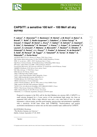 Résumé : Proposed in response to the ESA call for the third Medium size mission (M3), CAPSiTT is a small mission designed for a 3-year survey of the non-thermal high energy sky from an equatorial LEO orbit. With a large effective area and a very wide field of view, its single instrument, a silicon tracker, provides good imaging, spectroscopic and polarimetric capabilities with a sensitivity 10-100 times better than COMPTEL. Nucleosynthesis and particle acceleration mechanisms in various sites are the main scientific topics addressed by CAPSiTT.