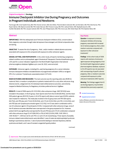 Résumé : Importance With the widespread use of immune checkpoint inhibitors (ICIs), concerns about their pregnancy outcomes through maternal exposure have emerged, and clinical comparative data are lacking. Objective To assess the risk of pregnancy-, fetal-, and/or newborn-related adverse outcomes associated with exposure to ICIs compared with exposure to other anticancer agents. Design, Setting, and Participants In this cohort study, all reports mentioning a pregnancy-related condition and an antineoplastic agent (Anatomical Therapeutic Chemical classification group L01) used for a cancer indication registered in the World Health Organization international pharmacovigilance database VigiBase up to June 26, 2022, were extracted. Exposure Anticancer agents, including ICIs, used during pregnancy for a cancer indication. Immune checkpoint inhibitors included blockers of programmed cell death 1 (PD1) or its ligand (PD-L1) or cytotoxic T-lymphocyte–associated protein 4 (CTLA4). Main Outcomes and Measures The main outcome was the reporting odds ratio (ROR) for maternal, fetal, or newborn complications in patients treated with ICIs vs any other anticancer drug. Adverse events, categorized into 45 individual maternofetal adverse outcomes, were directly mapped to Medical Dictionary for Regulatory Activities preferred terms in VigiBase. Results A total of 3558 reports (ICI: 91 [2.6%]; other anticancer drugs: 3467 [97.4%]) were included in the analysis. In the ICI group, most reports were from the US (60 [65.9%]), and the mean (SD) patient age was 28.9 (10.2) years; in 24 of 55 reports with data on cancer type (43.6%), patients were treated for melanoma. The molecules involved in the ICI group were anti-PD1 (58 reports [63.7%]), anti-PD1 plus anti-CTLA4 (15 [16.5%]), anti-CTLA4 (13 [14.3%]), anti–PD-L1 (4 [4.4%]), and anti-PD1 plus anti–lymphocyte activation gene 3 (1 [1.1%]). An ICI was used in combination with a non-ICI anticancer agent in 10 participants (11.0%). Compared with other anticancer drugs, none of the 45 adverse outcomes identified were overreported in the group exposed to ICIs. However, preterm birth was significantly overreported for the anti-PD1 plus anti-CTLA4 combination compared with other anticancer drugs (12 of 15 [80.0%] vs 793 of 3452 [23.0%]; ROR, 13.87; 95% CI, 3.90-49.28; P < .001) but not for anti–PD-L1 or anti-CTLA4 monotherapy. Three reports of possibly immune-related maternofetal events were identified: 1 case of maternal antiphospholipid syndrome leading to spontaneous abortion, 1 case of pneumonitis leading to neonatal respiratory distress syndrome and death, and 1 case of transient congenital hypothyroidism. Conclusions and Relevance In this cohort study of 91 individuals exposed to ICIs during pregnancy, ICI exposure was not associated with overreporting of specific adverse pregnancy, fetal, and/or newborn outcomes compared with other anticancer treatments. However, due to possible rare immune-related neonatal adverse events, ICI use in pregnant women should be avoided when possible, especially the anti-PD1 plus anti-CTLA4 combination.