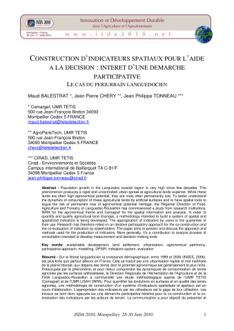 CONSTRUCTION D'INDICATEURS SPATIAUX POUR L'AIDE A LA DECISION : INTERET D'UNE DEMARCHE PARTICIPATIVE LE CAS DU PERIURBAIN LANGUEDOCIEN