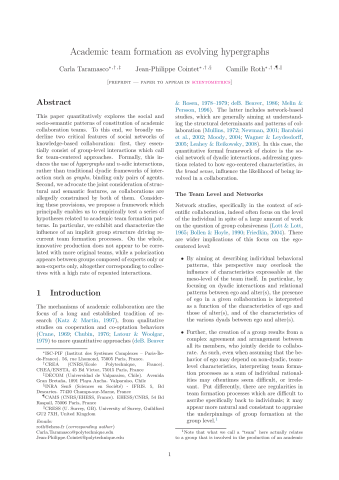 Résumé : This paper quantitatively explores the social and socio-semantic patterns of constitution of academic collaboration teams. To this end, we broadly underline two critical features of social networks of knowledge-based collaboration: first, they essentially consist of group-level interactions which call for team-centered approaches. Formally, this induces the use of hypergraphs and n-adic interactions, rather than traditional dyadic frameworks of interaction such as graphs, binding only pairs of agents. Second, we advocate the joint consideration of structural and semantic features, as collaborations are allegedly constrained by both of them. Considering these provisions, we propose a framework which principally enables us to empirically test a series of hypotheses related to academic team formation patterns. In particular, we exhibit and characterize the influence of an implicit group structure driving recurrent team formation processes. On the whole, innovative production does not appear to be correlated with more original teams, while a polarization appears between groups composed of experts only or non-experts only, altogether corresponding to collectives with a high rate of repeated interactions.