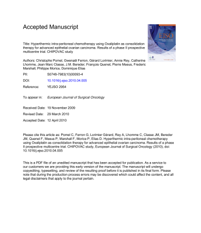 Hyperthermic intra-peritoneal chemotherapy using Oxaliplatin as consolidation therapy for advanced epithelial ovarian carcinoma. Results of a phase II prospective multicentre trial. CHIPOVAC study