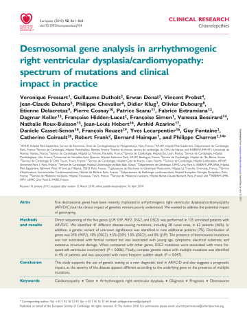 Résumé : AIMS: Five desmosomal genes have been recently implicated in arrhythmogenic right ventricular dysplasia/cardiomyopathy (ARVD/C) but the clinical impact of genetics remains poorly understood. We wanted to address the potential impact of genotyping. METHODS AND RESULTS: Direct sequencing of the five genes (JUP, DSP, PKP2, DSG2, and DSC2) was performed in 135 unrelated patients with ARVD/C. We identified 41 different disease-causing mutations, including 28 novel ones, in 62 patients (46%). In addition, a genetic variant of unknown significance was identified in nine additional patients (7%). Distribution of genes was 31% (PKP2), 10% (DSG2), 4.5% (DSP), 1.5% (DSC2), and 0% (JUP). The presence of desmosomal mutations was not associated with familial context but was associated with young age, symptoms, electrical substrate, and extensive structural damage. When compared with other genes, DSG2 mutations were associated with more frequent left ventricular involvement (P = 0.006). Finally, complex genetic status with multiple mutations was identified in 4% of patients and was associated with more frequent sudden death (P = 0.047). CONCLUSION: This study supports the use of genetic testing as a new diagnostic tool in ARVC/D and also suggests a prognostic impact, as the severity of the disease appears different according to the underlying gene or the presence of multiple mutations.