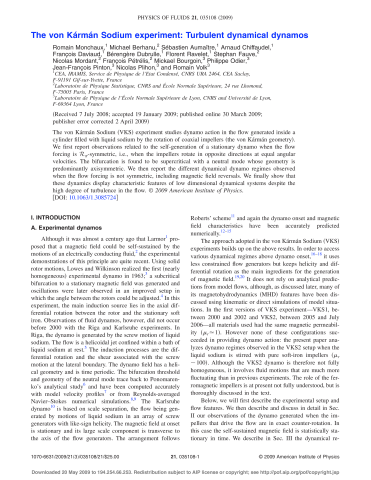 Résumé : The von Karman Sodium (VKS) experiment studies dynamo action in the flow generated inside a cylinder filled with liquid sodium by the rotation of coaxial impellers (the von Karman geometry). We first report observations related to the self-generation of a stationary dynamo when the flow forcing is R-pi-symmetric, i.e., when the impellers rotate in opposite directions at equal angular velocities. The bifurcation is found to be supercritical with a neutral mode whose geometry is predominantly axisymmetric. We then report the different dynamical dynamo regimes observed when the flow forcing is not symmetric, including magnetic field reversals. We finally show that these dynamics display characteristic features of low dimensional dynamical systems despite the high degree of turbulence in the flow.