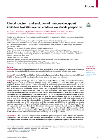 Résumé : Background: Immune-checkpoint inhibitors (ICI) have revolutionized cancer treatment by harnessing the immune system but ICI can induce life-threatening immune-related adverse events (irAE) affecting every organ. Methods: We extracted irAE from VigiBase, the international pharmacovigilance database, first reported in 2008 until 01/2023 to characterize irAE reporting trends, clinical features, risk factors and outcomes. Findings: We distinguished 25 types of irAE (n = 50,347cases, single irAE/case in 84.9%). Cases mainly involved anti-PD1 (programmed-death-1) monotherapy (62.4%) in male (61.7%) aged 64.3 ± 12.6 years. After 2020 vs. prior to 2016, proportion of anti-CTLA4 (Cytotoxic-T-Lymphocyte-Antigen-4) monotherapy prescription almost vanished (1.6% vs. 47%, respectively) contrasting with increased use of anti-PDL1 (PD1-ligand) monotherapy (18% vs. 0.9%) and anti-CTLA4+anti-PD(L)1 combination (20% vs. 8.9%). Anti-LAG3 (Lymphocyte-Activation-Gene-3) prescription was limited (<1%) in the studied timeframe. After 2020, over 14 different cancer types were treated vs. almost exclusively melanoma and lung cancers before 2016. Overall, the most reported irAE were skin reactions (22.9%), pneumonitis (18.5%), enterocolitis (14.4%) and thyroiditis (12.1%). ICI-myotoxicities (6.6%) included myositis, myocarditis and myasthenia-gravis like syndrome and were the most overlapping irAE (up to 30% overlap, vs. <3% in general for other inter-irAE overlap). The top factors associated with specific irAE (odds-ratio>5) were presence of thymic cancer for ICI-myotoxicities or hepatitis; presence of melanoma for vitiligo, uveitis or sarcoidosis; specific types of ICI regimen (anti-LAG3 for meningitis, anti-CTLA4 for hypophysitis); and specific reporting regions (eastern Asia for cholangitis). Median time-to-onset ranged from 31 to 273 days, being shortest for myotoxicities and most delayed for skin-bullous auto-immune reactions. Overall fatality was highest for myocarditis = 27.6%, myasthenia = 23.1%, severe cutaneous adverse reactions (SCAR) = 22.1%, myositis = 21.9%, pneumonitis = 21%, and encephalomyelitis = 18%; generally decreasing after 2020, except for myasthenia and SCAR. When reported, irAE recurrence rate after rechallenge was 28.9% (n = 275/951). Interpretation: This up-to-date comprehensive worldwide pharmacovigilance study defines the spectrum, characteristics, and evolution of irAE reporting summarizing over a decade of use. Multiple risk factors and clinical peculiarities for specific irAE have been identified as signals to guide clinical practice and future research.